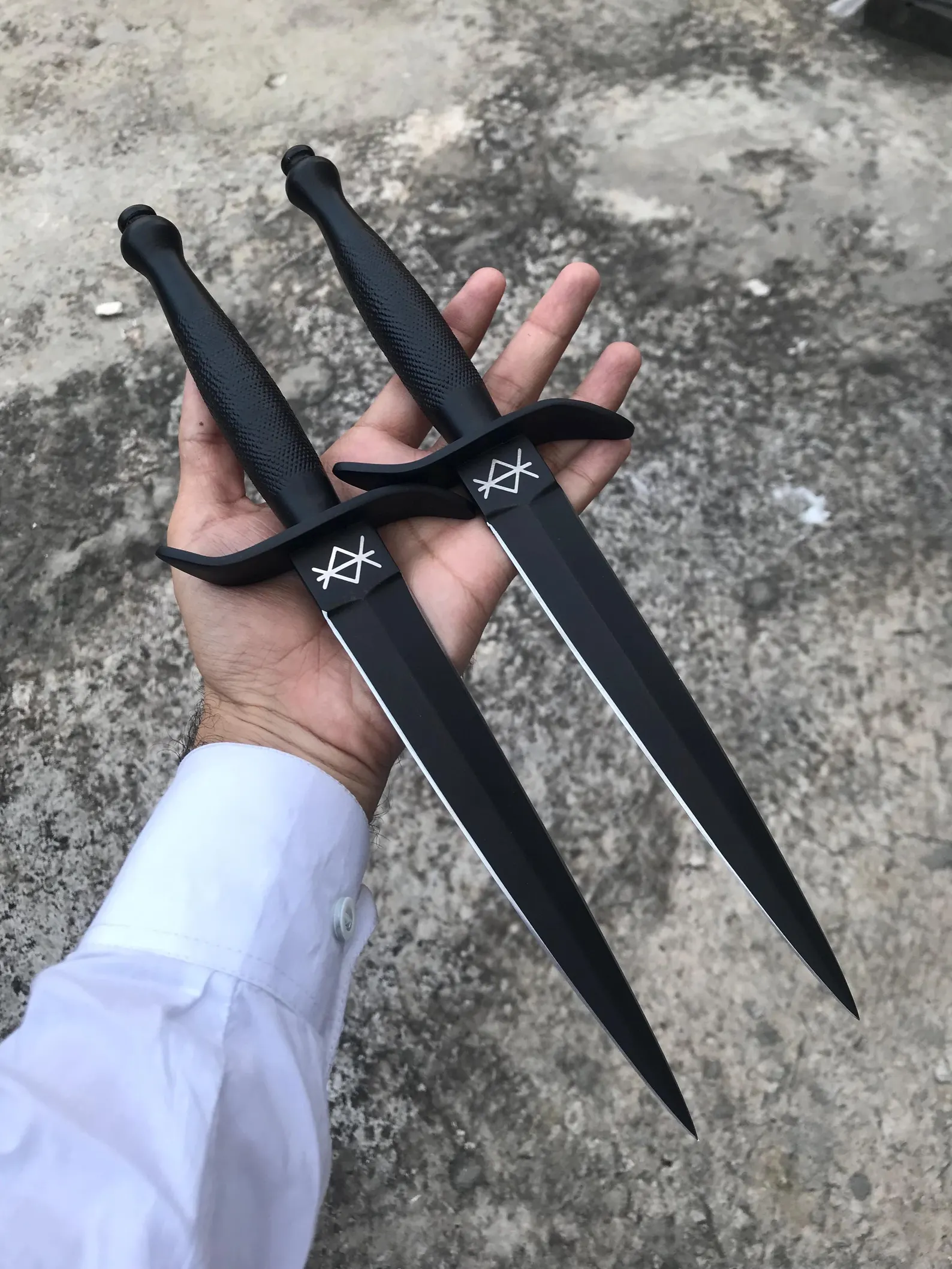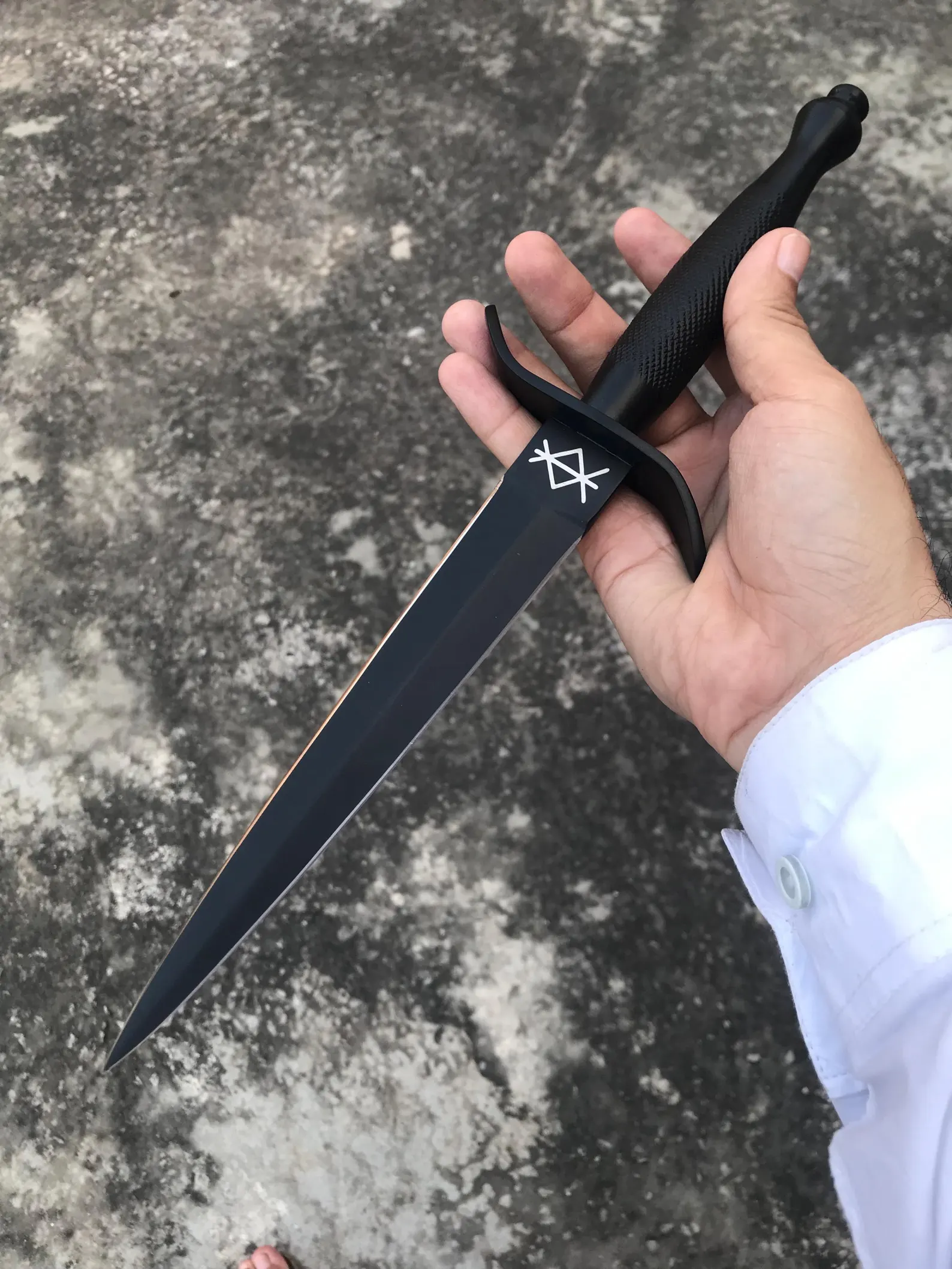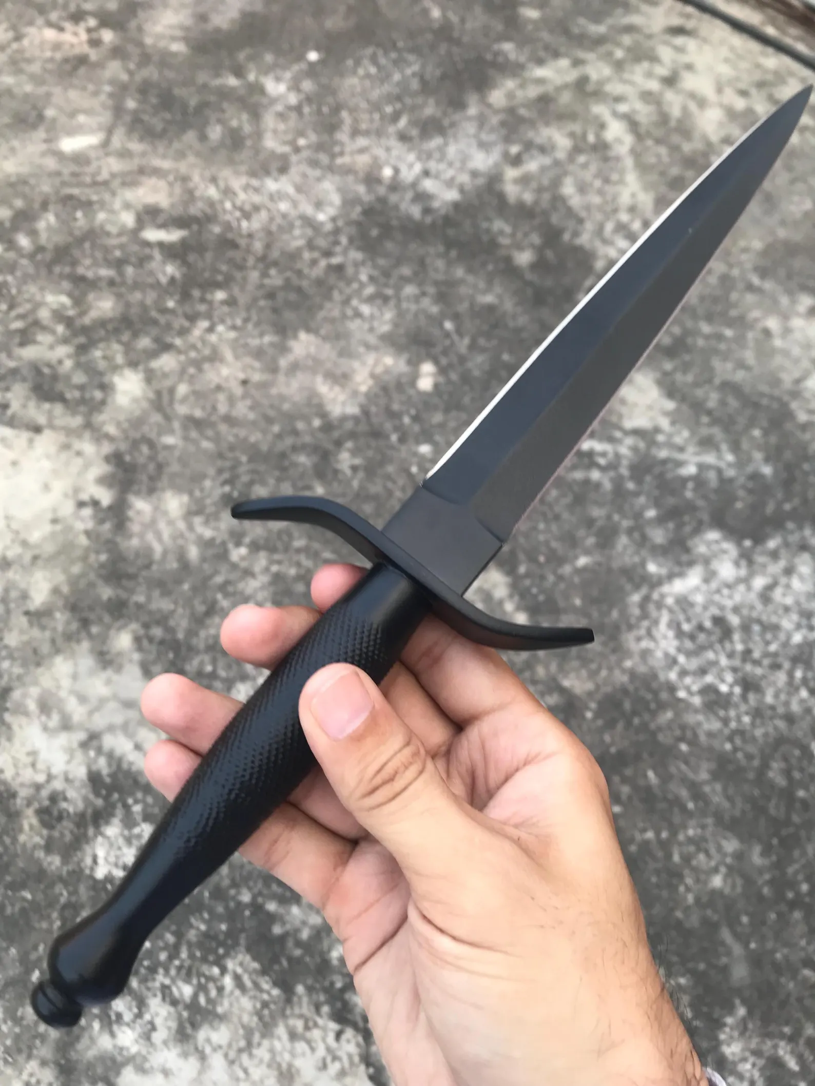 British Army Commando Dagger Knife Black Powder Coated Carbon Steel, Leather Sheath