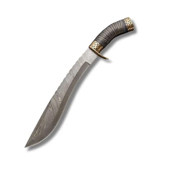 Expertly forged using traditional techniques, this machete features a stunning Damascus wave pattern, enhancing both its strength and aesthetic appeal. The full-tang construction ensures exceptional balance and durability, while the ergonomic handle provides a secure, comfortable grip for extended use.