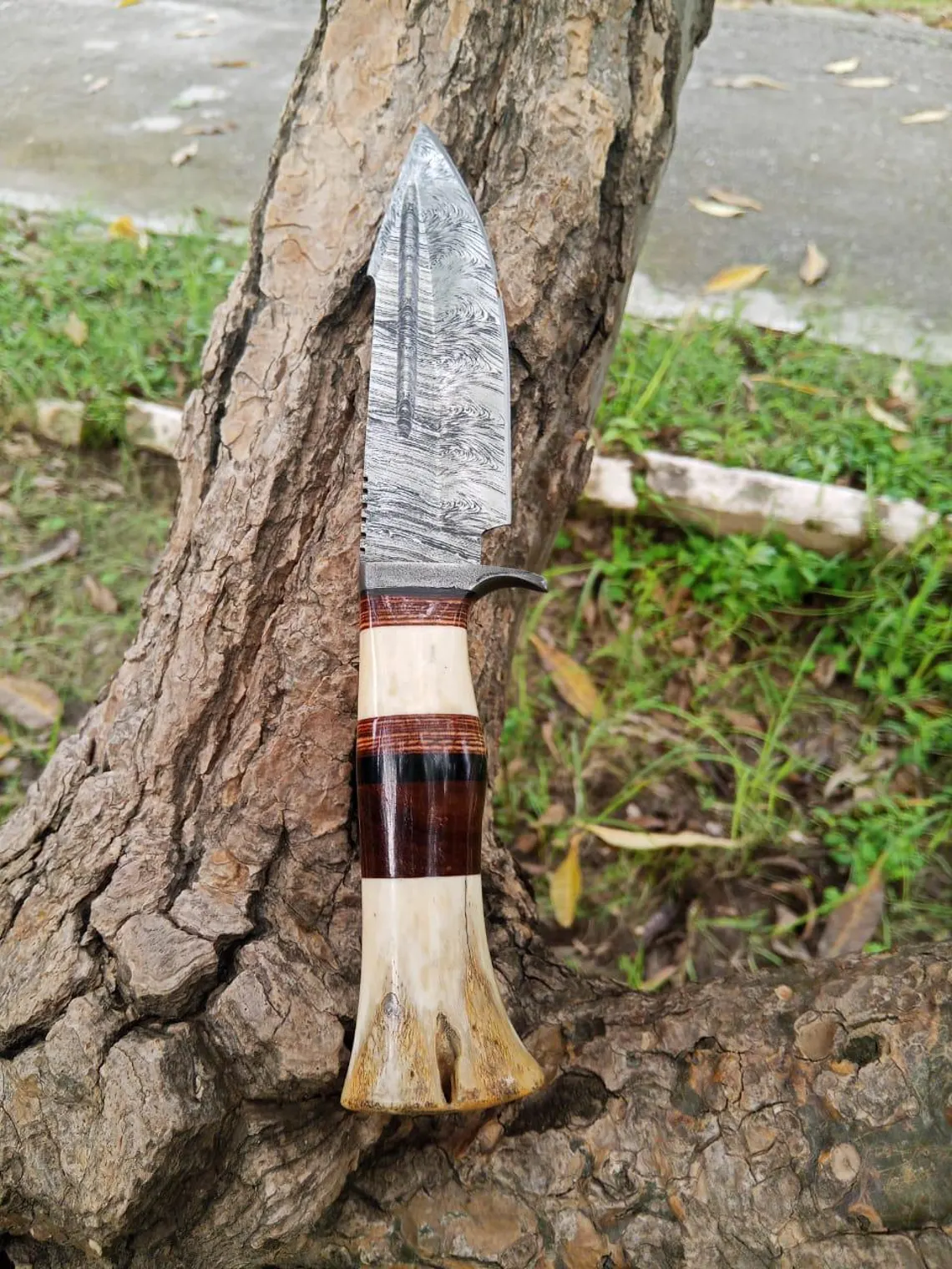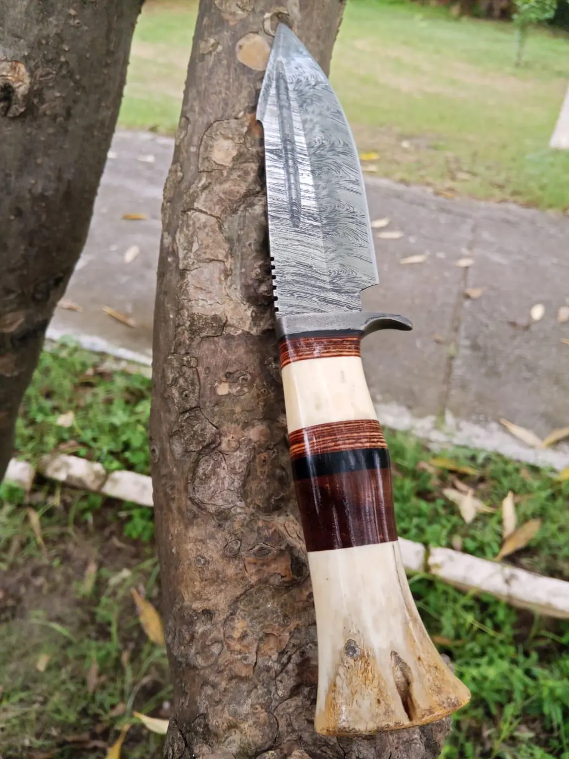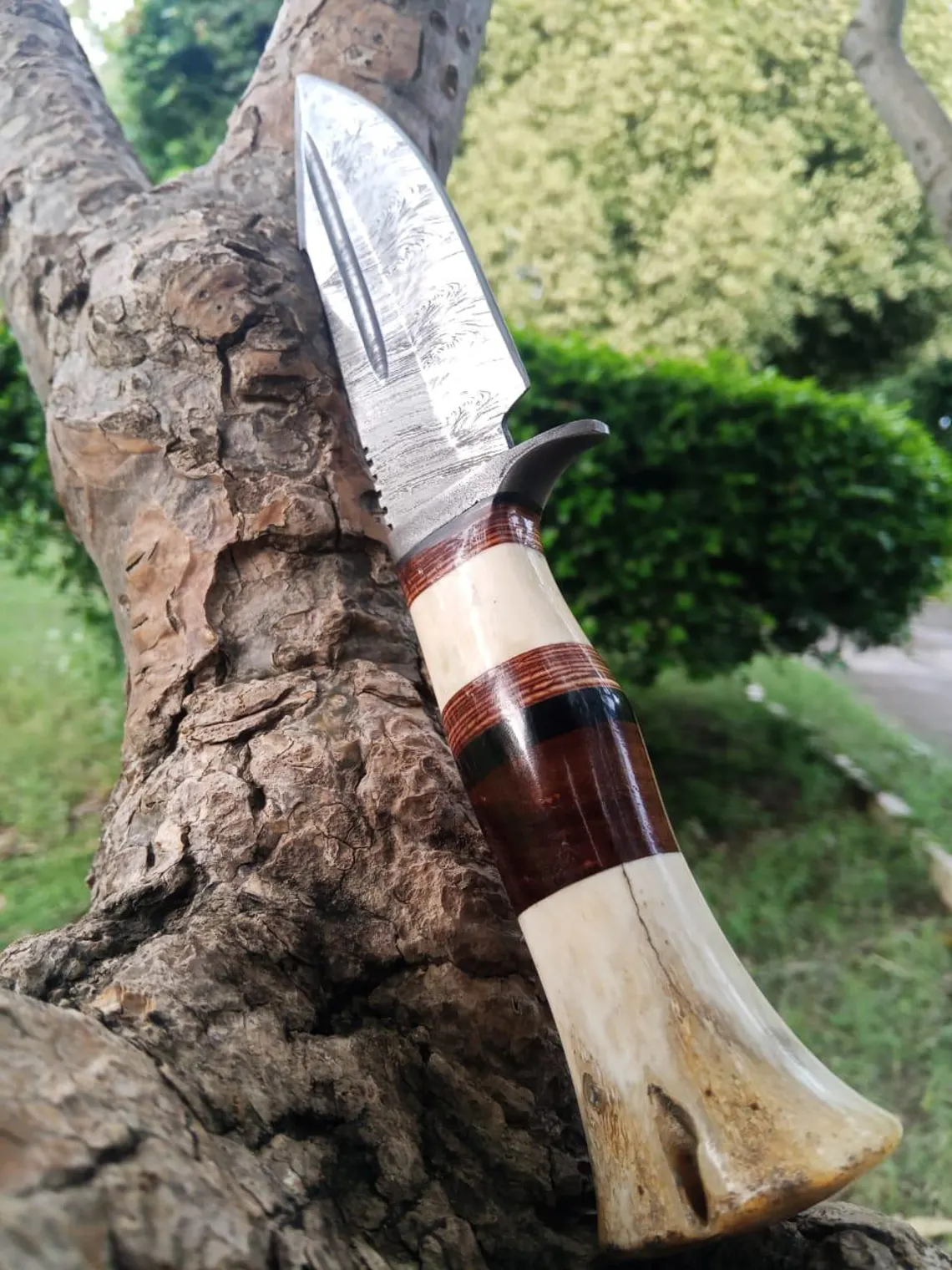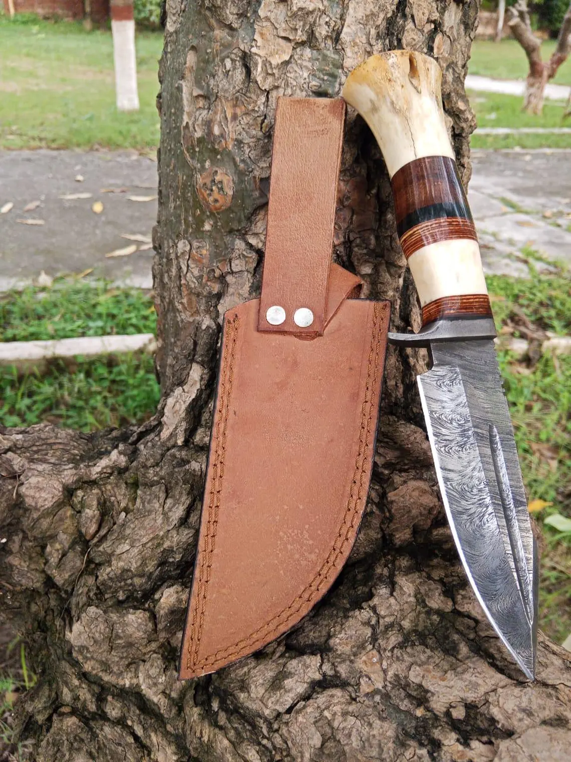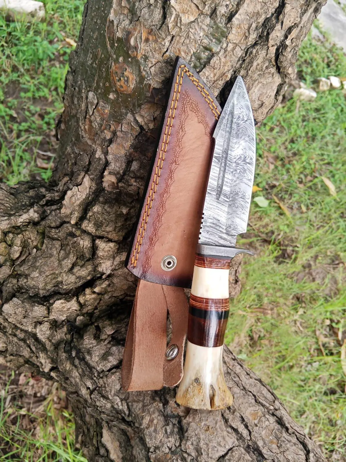 Damascus Steel Blade of 5 inch Expertly forged for exceptional sharpness, durability, and distinctive patterns that showcase the art of Damascus steel craftsmanship, and moreover it has an 4.5 inch BoneWoodHandle,Ergonomically designed for comfort, style, and a secure grip, featuring a harmonious blend of natural bone and rich hardwood and leather pure Handcrafted Excellence: Full tang construction ensures maximum strength, premium materials guarantee durability, and meticulous attention to detail reflects the artisan’s passion- Perfect for: Hunting, Camping, Bushcraft, Outdoor Survival, and discerning collectors who appreciate the finer things in life Includes: Custom hand-stitched leather sheath for safe carrying and storage, crafted with the same attention to detail as the knife itself .A true masterpiece for outdoor enthusiasts and collectors alike, this knife is a testament to the art of handcrafted excellence “