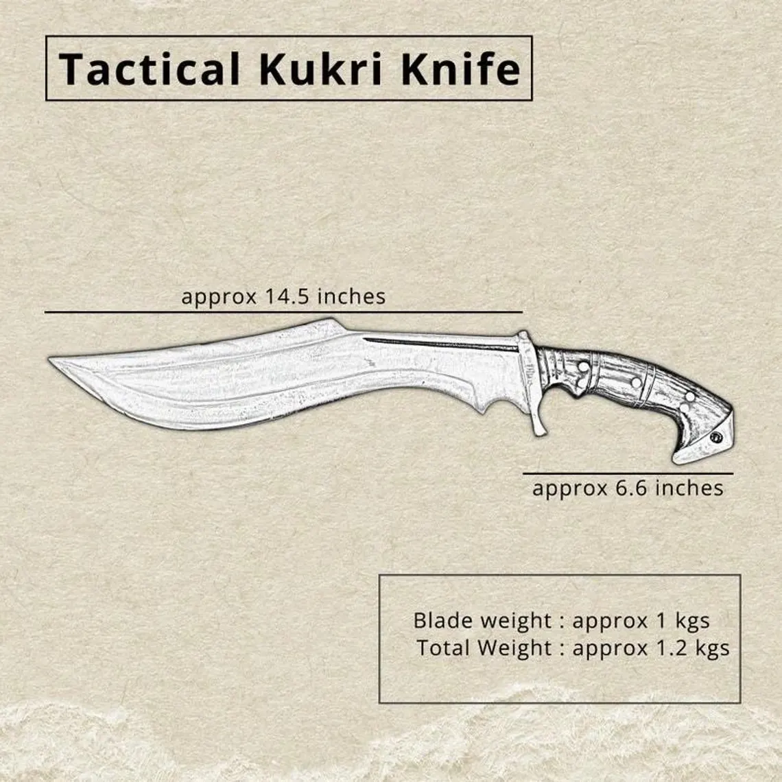 21-inch Aesthetic Handmade Historical Kukri Knife has a 14.5-inch blade made up of the highly graded carbon steel. This fully functional and working knife has a full tang handle of length 6.6 inch and is made of high-quality Rosewood. This functional knife is hand forged in the country of the Himalayas. The handle of the blade is made of Rosewood. This knife can be used as both hunting and household tools. The total weight of the knife is 1225 grams approximately and the weight of the blade excluding the sheath is 1020 grams approximately.