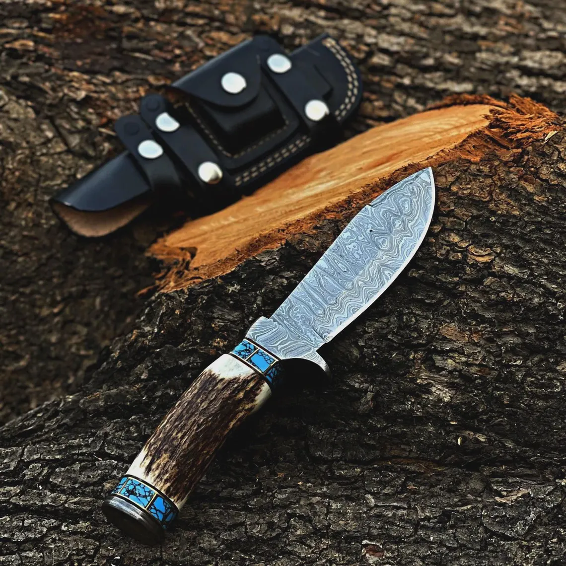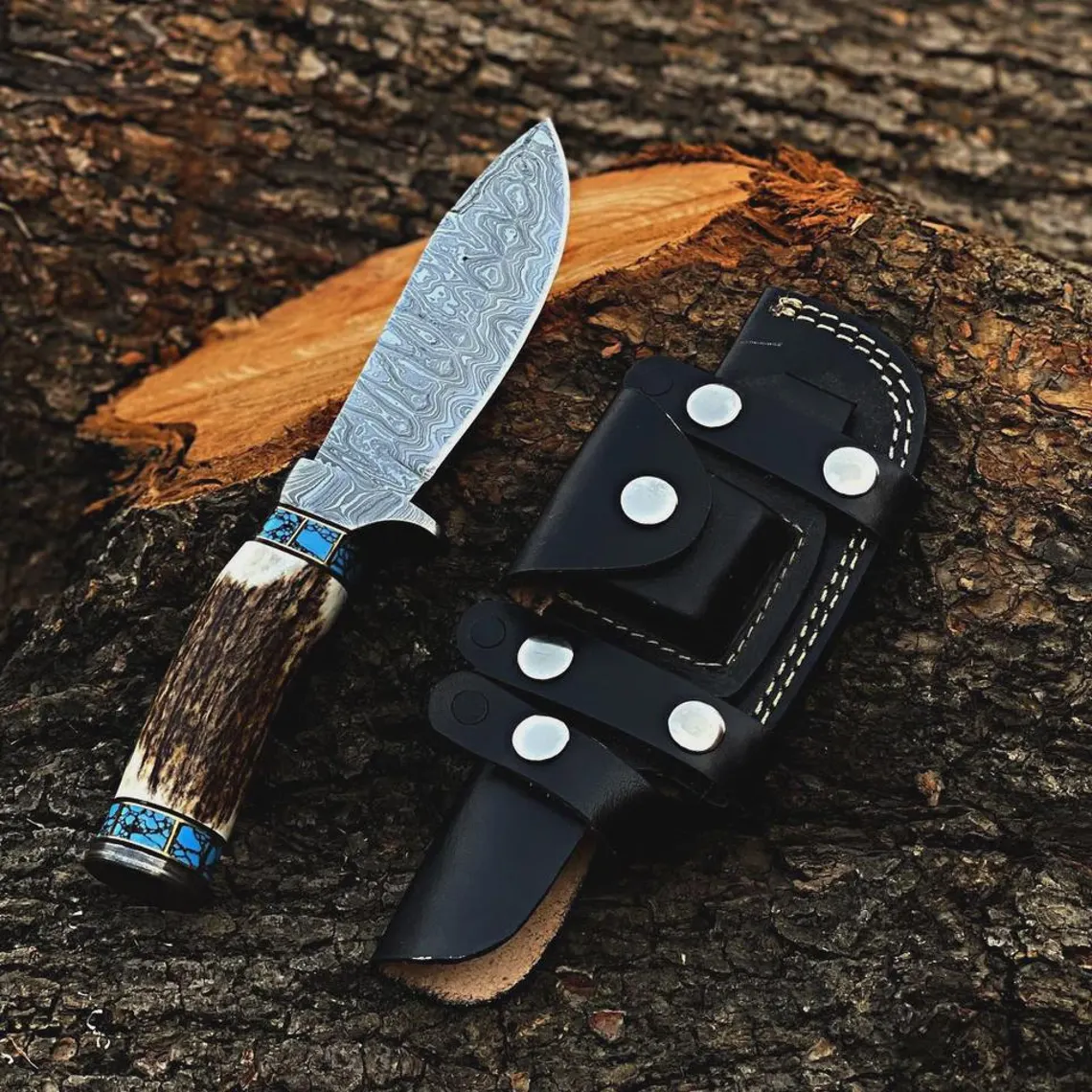 The handle is made from genuine crown stag antler, providing a natural grip and classic look. Decorative stone spacers add durability and visual appeal. Its compact and well-balanced design makes it ideal for skinning, hunting, camping, or display. A high-quality leather sheath is included for safe storage and easy carry.