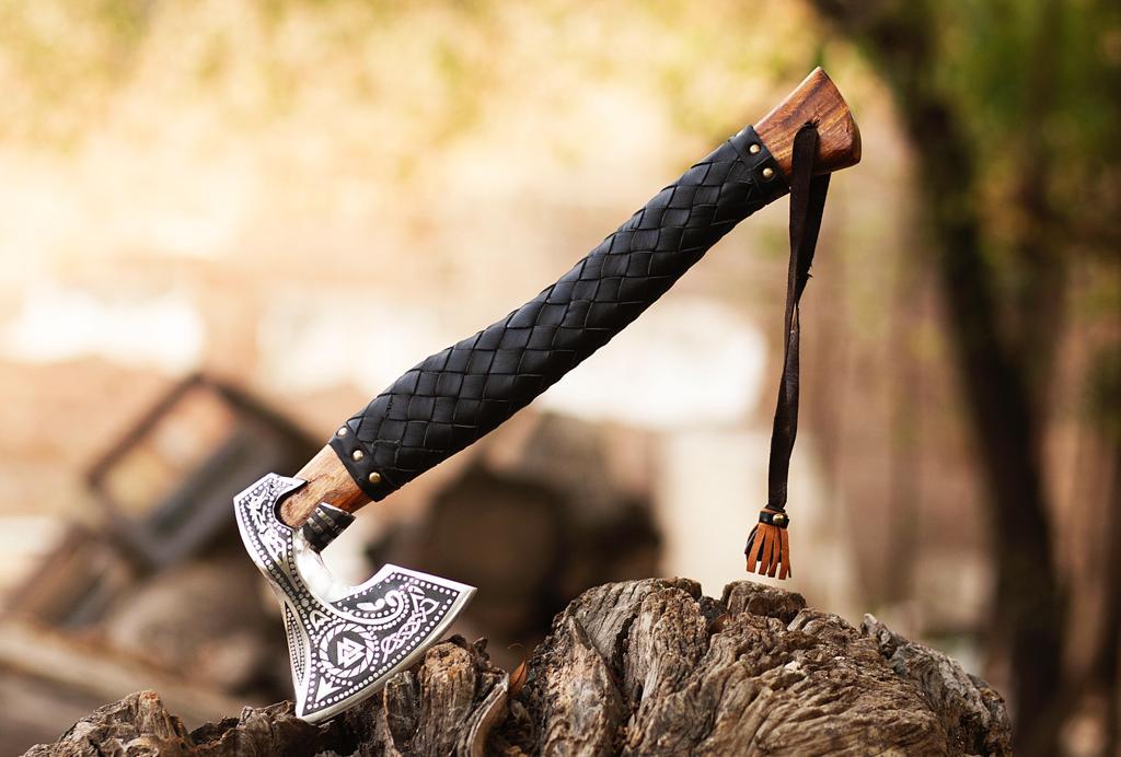 This custom-made Ragnar Viking Axe is handcrafted with a premium forged steel blade and a rosewood handle wrapped in leather. The high-quality etching on the blade adds a unique touch, making it perfect for both practical use and display.